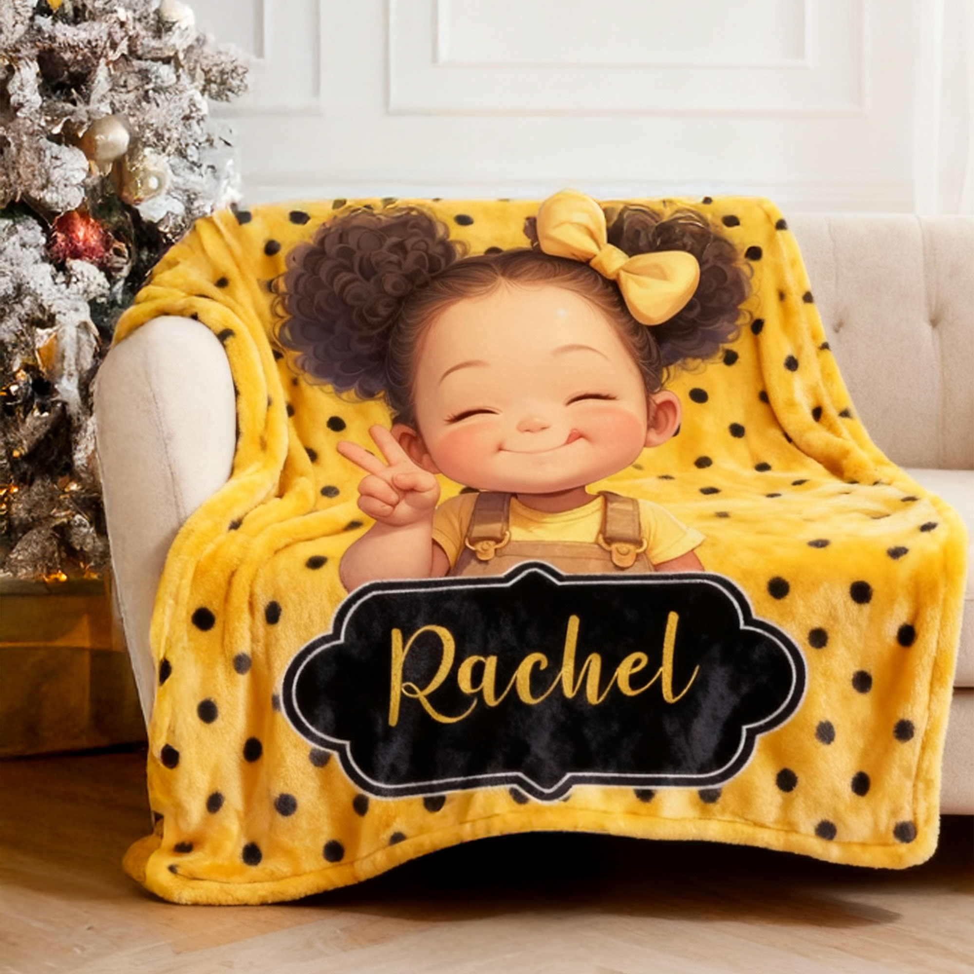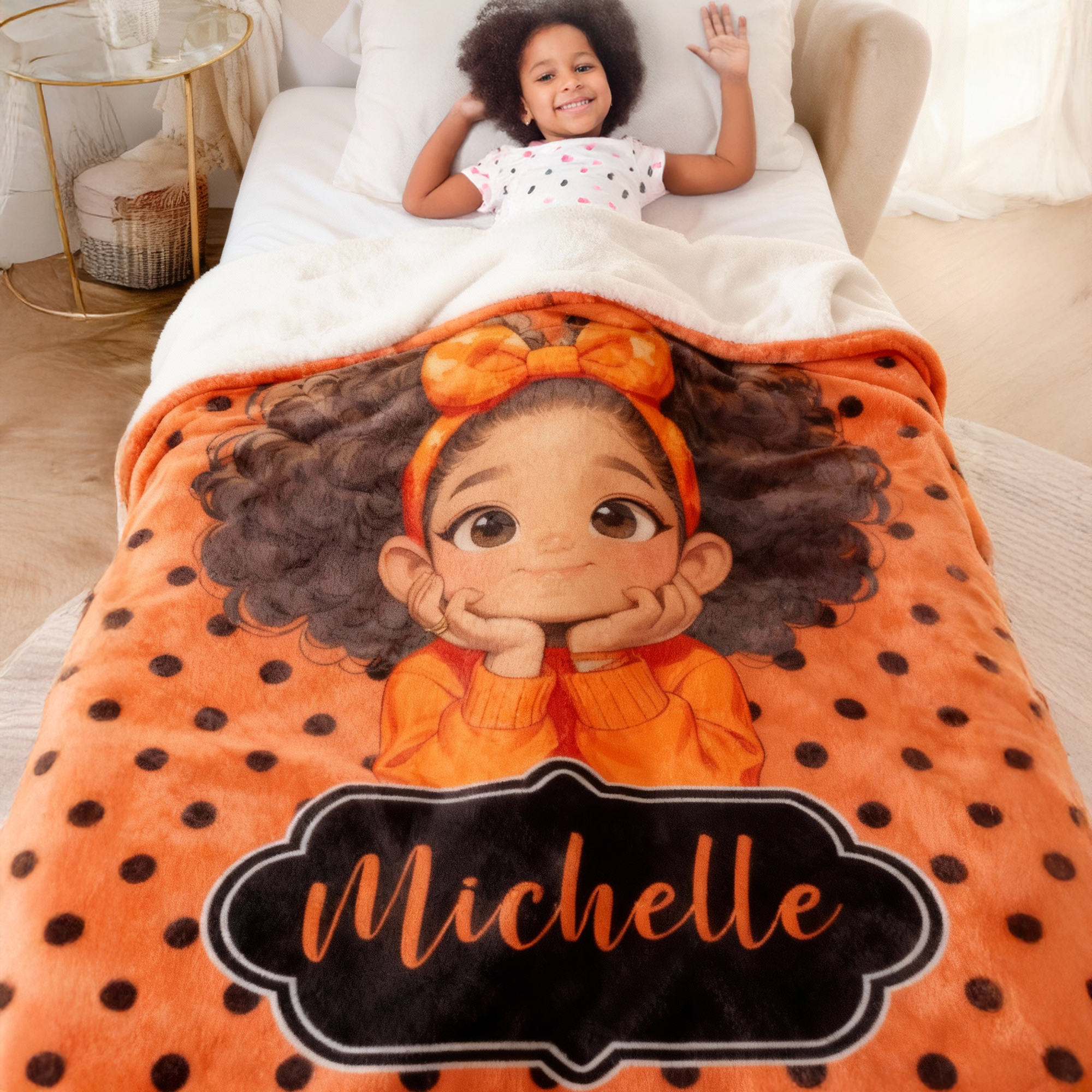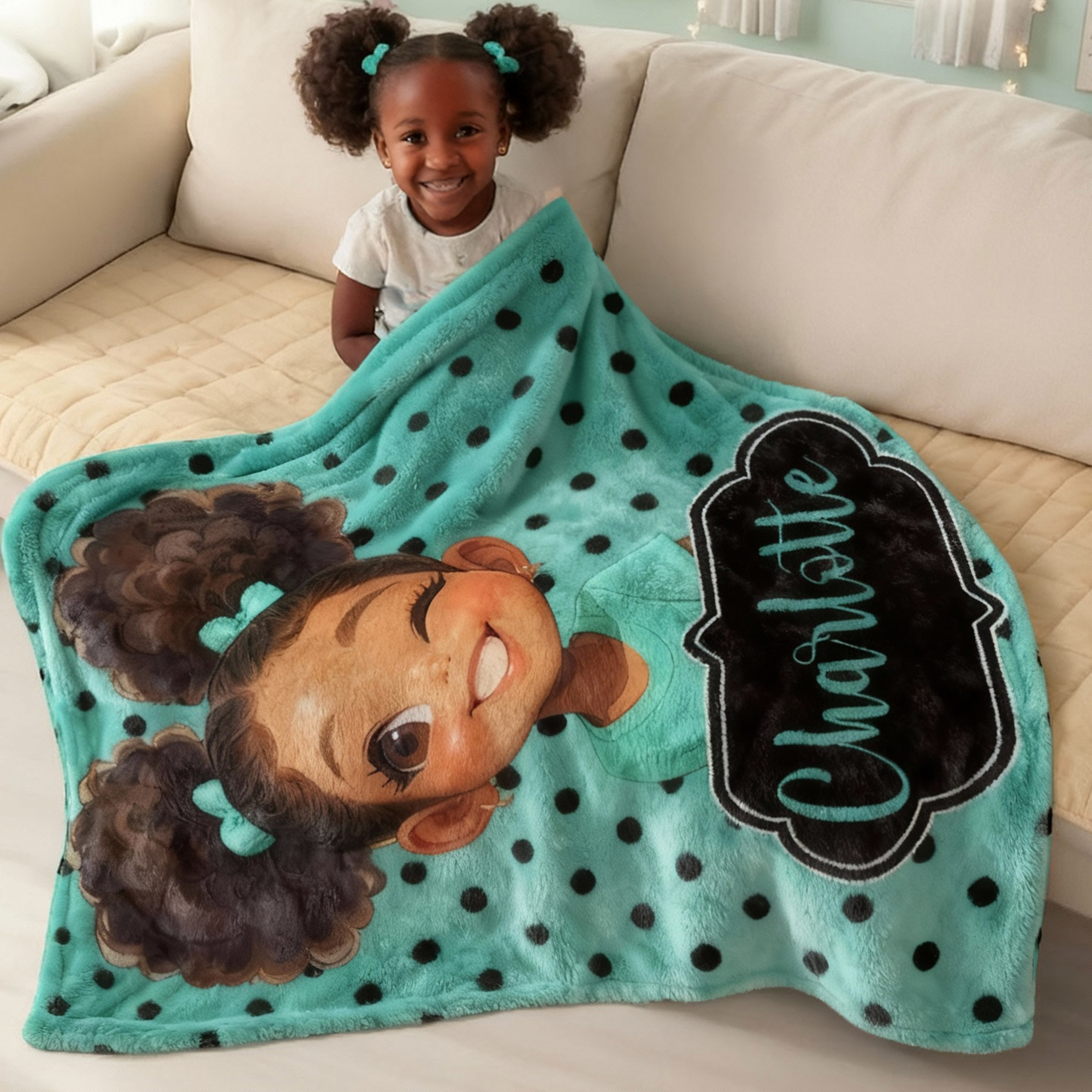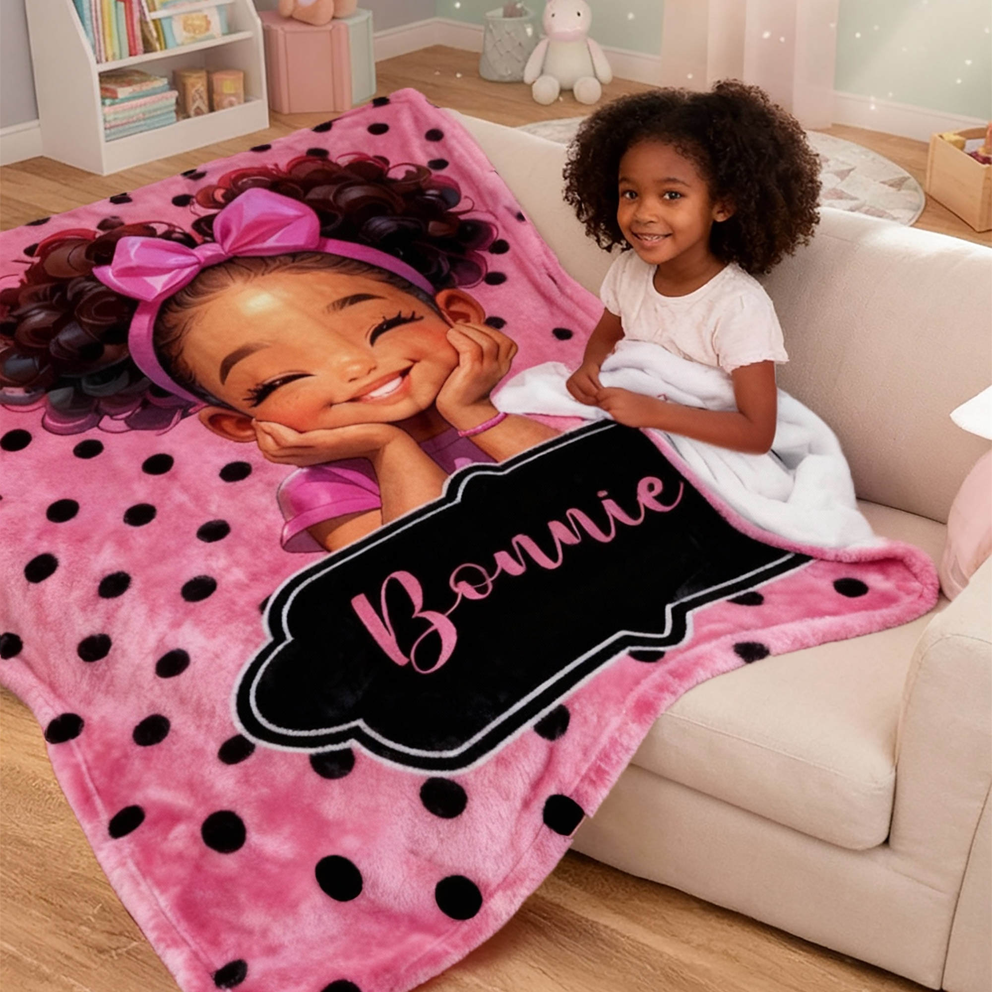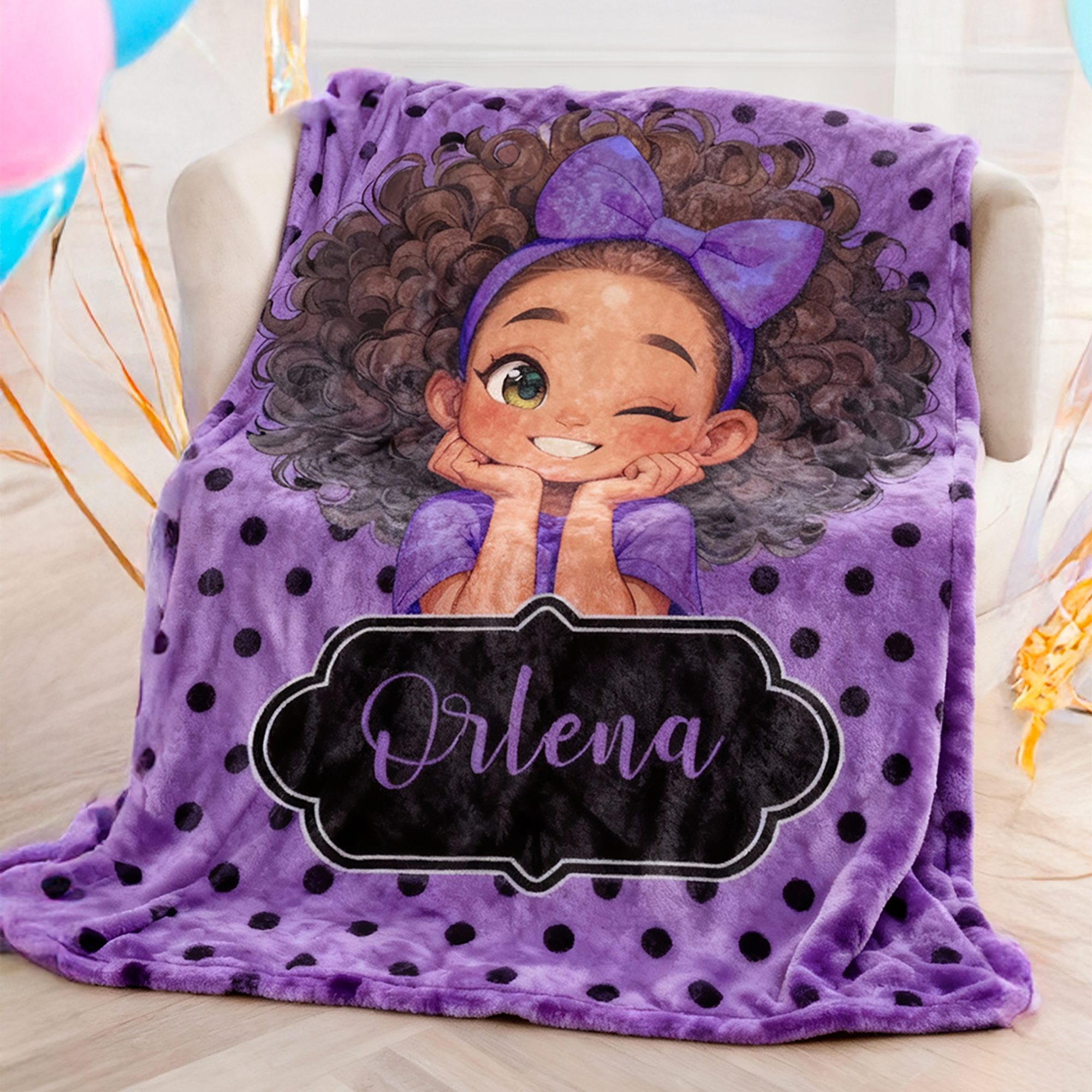 | Style | Personalized Name Cartoon Afro Black Girl Polka Dots Blanket |